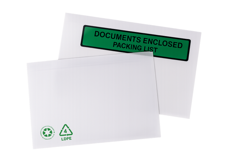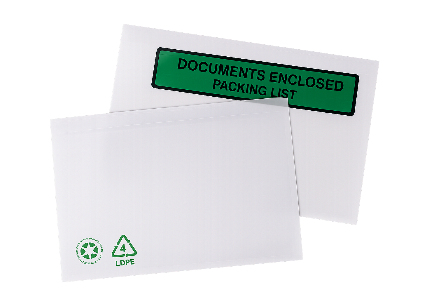 Verkrijgbaar in blanco, met standaard bedrukking zoals "Documents enclosed/packing list", of eigen opdruk